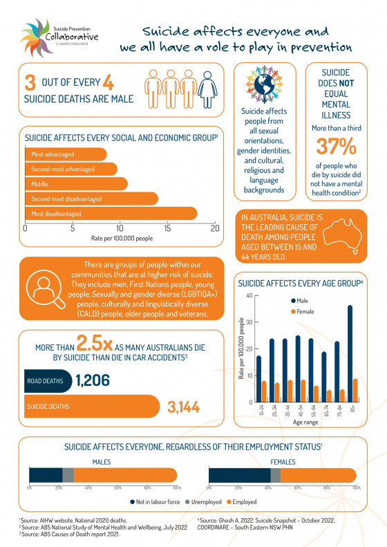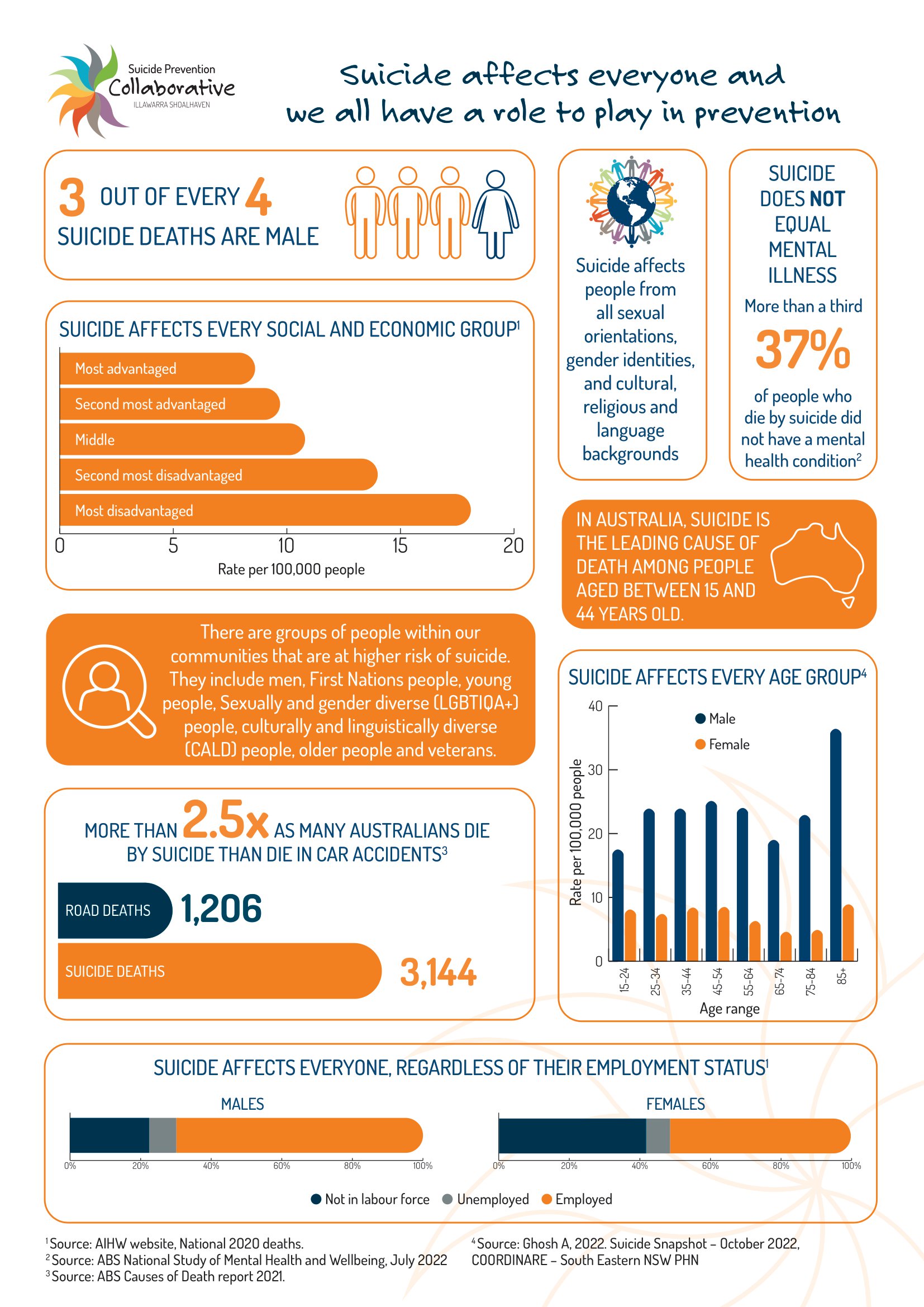 Suicide rates in the Illawarra Shoalhaven region are higher than national and NSW state averages (age standardised rates per 100,000 population). Based on a five-year average, in the Illawarra Shoalhaven region we lose 55 people to suicide each year.