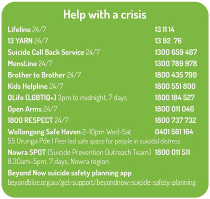 Lifeline, 24/7 crisis support | phone: 13 11 14, text: 0477 13 11 14, webchat: lifeline.org.au/crisis-chat